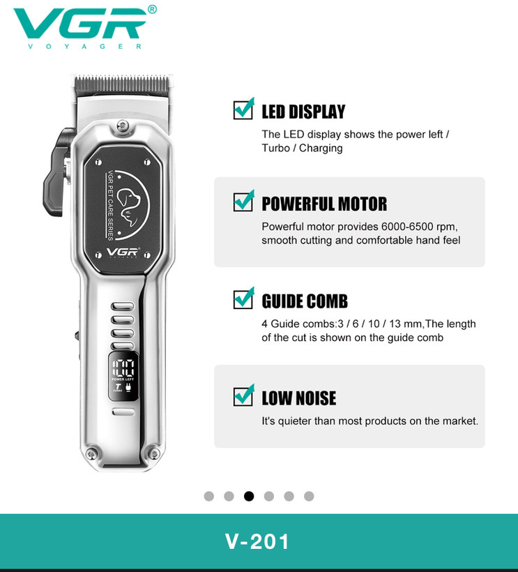 اگر به دنبال بهترین ماشین اصلاح حیوانات وی جی ار برای استفاده حرفهای در آرایشگاهها، کلینیکهای دامپزشکی و نمایشگاههای حیوانات هستید، V-201 انتخاب بیرقابت خواهد بود. با باتری ۲۰۰ دقیقهای و سیستم خنککننده مایع، این دستگاه استانداردهای جدیدی در صنعت تعریف میکند.