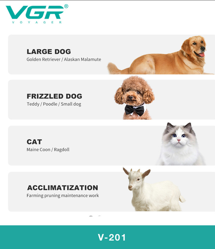 | ۱ | مدل دستگاه | VGR V-201 ماشین اصلاح حرفهای حیوانات | طراحی شده برای استفاده سنگین روزانه |