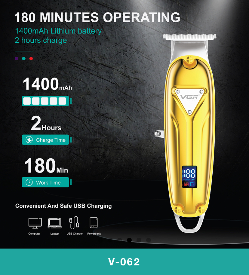 ماشین اصلاح خط زن VGR مدل V-062 | شارژ سریع 5 دقیقهای۱ | 180 دقیقه کارکرد۲