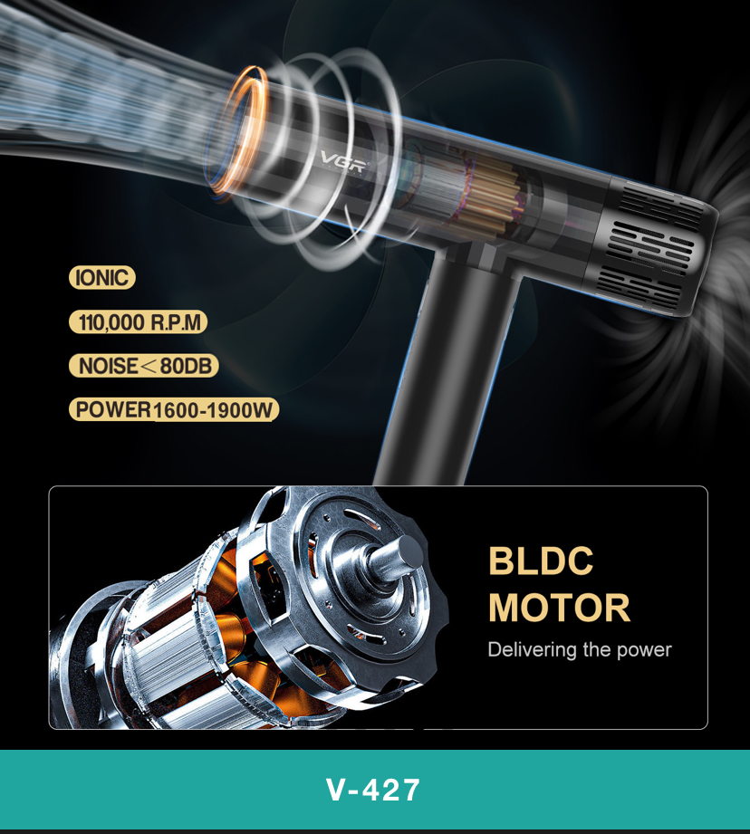 ویژگیهای کلیدی که V-427 را از رقبا متمایز میکند: موتور AC با عمر ۲۰۰۰ ساعت، فناوری یون منفی برای کاهش وز مو، ۴ حالت دمایی (۶۰ تا ۱۲۰ درجه)، ۳ حالت سرعت (۵۰۰۰ تا ۱۱۰۰۰۰ دور)، سریهای متنوع و گارانتی ۱۸ ماهه طلایی.