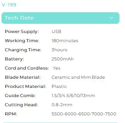 اگر به دنبال بهترین ماشین حجم زن وی جی ار هستید که هم قدرت فوقالعاده داشته باشد و هم برای فید و سایهزنی حرفهای مناسب باشد، V-199 انتخاب بینظیری است. با باتری 2500mAh و حالت توربو، این ماشین اصلاح حجم زن حرفهای برای آرایشگاههای شلوغ ایدهآل است.