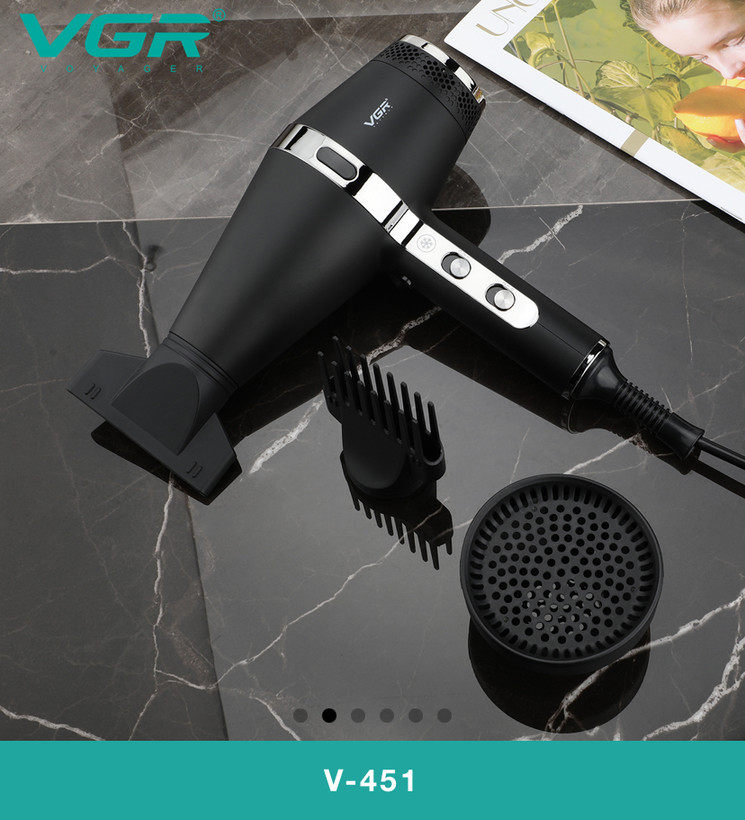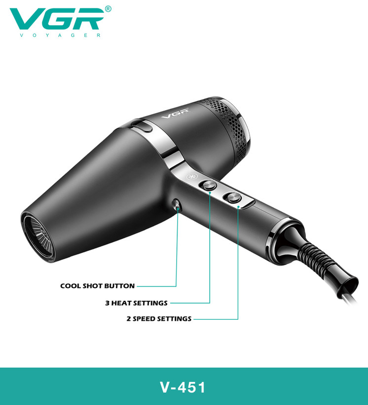 سشوار VGR V-451 به موتور توربوجت با توان 2200 وات مجهز شده است. این موتور قدرتمند قادر است بادی با سرعت و دمای بالا تولید کند که خشک کردن موها را سریع و کارآمد میسازد.