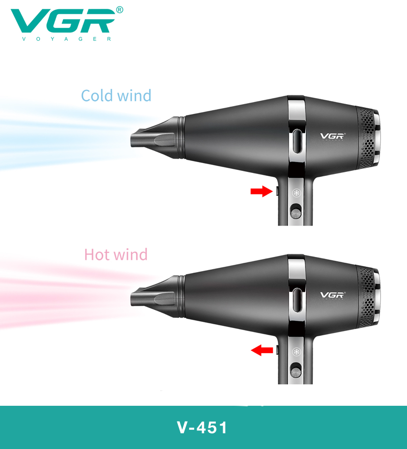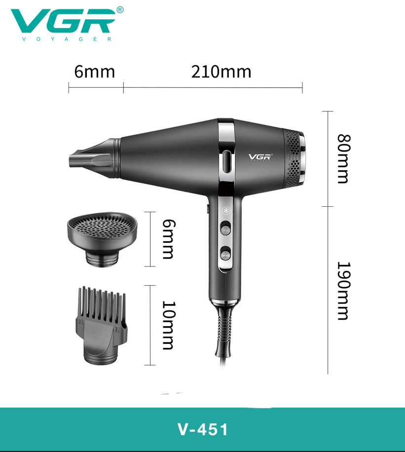 سشوار VGR V-451 به موتور توربوجت با توان 2200 وات مجهز شده است. این موتور قدرتمند قادر است بادی با سرعت و دمای بالا تولید کند که خشک کردن موها را سریع و کارآمد میسازد.