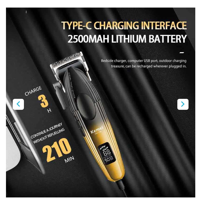 ماشین اصلاح کیمی KM-1788 به باتری لیتیومیون ۲۵۰۰mAh مجهز شده است. این باتری قدرتمند قادر است دستگاه را تا ۲۱۰ دقیقه (۳.۵ ساعت) به طور مداوم کار کند که برای ۱۵-۲۰ مشتری در روز کافی است.